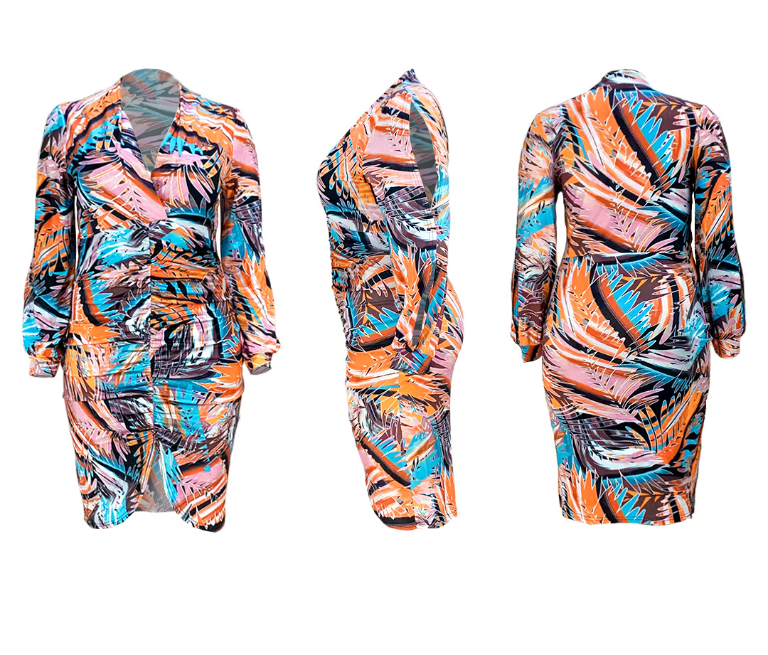 Plus Size Women Clothes V neck Floral Print Slit Pleated Hollow Out Cutout Sleeve Dress