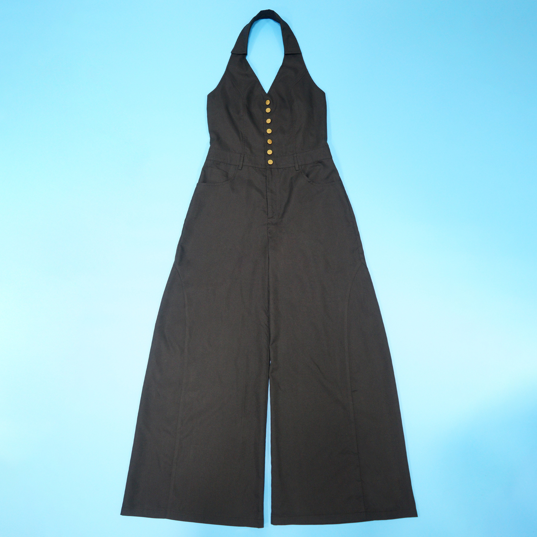 Step into summer with this slim-fit casual jumpsuit, featuring a collared neckline, button details, handy pockets, and a chic backless design. Stylish, lightweight, and perfect for warm-weather days.